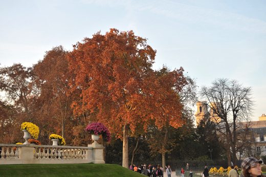 公園の一角に紅葉がついてる木が数本ありました。風向きのせいかな。。。後ろに見えるのはサン・シュルピス教会。